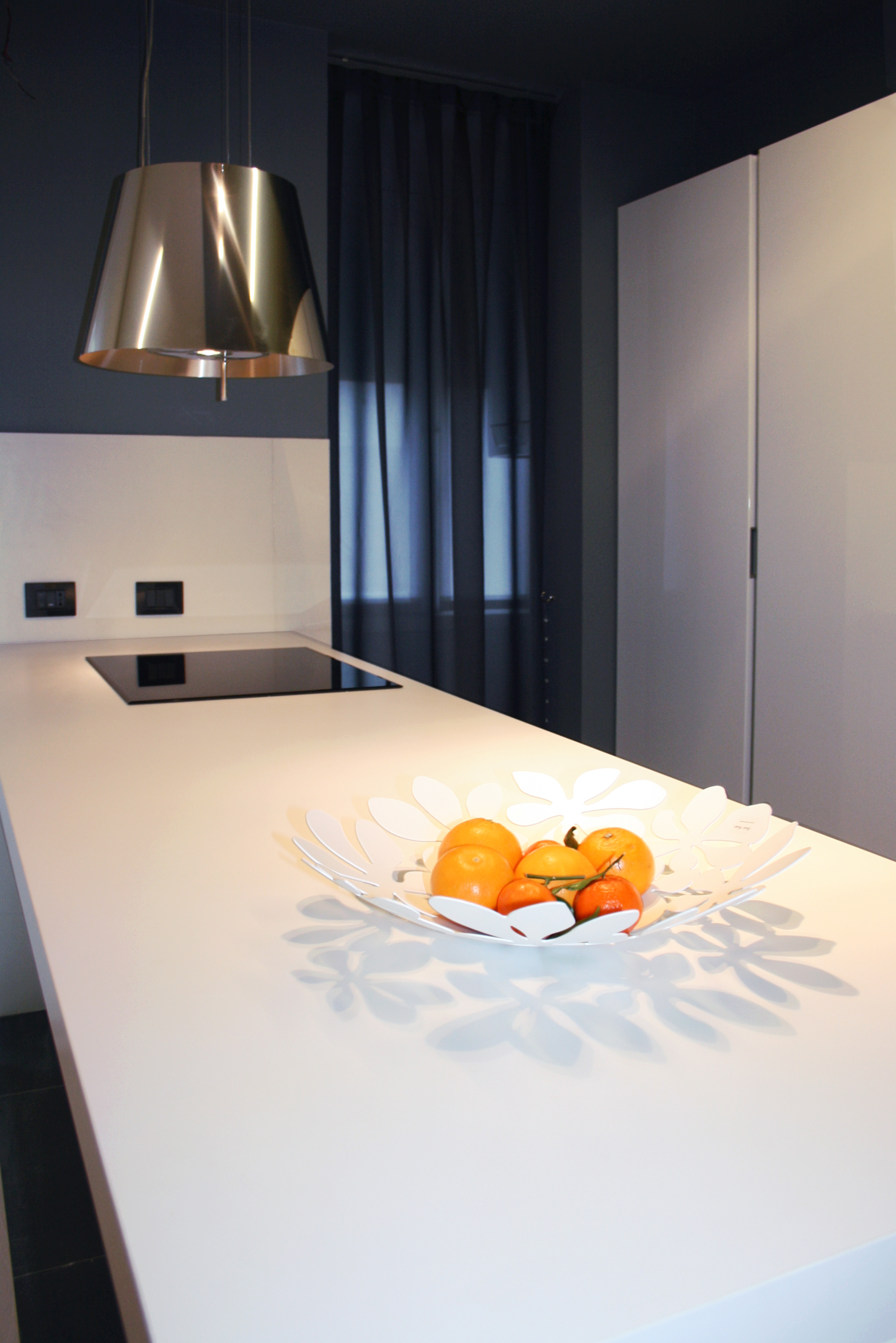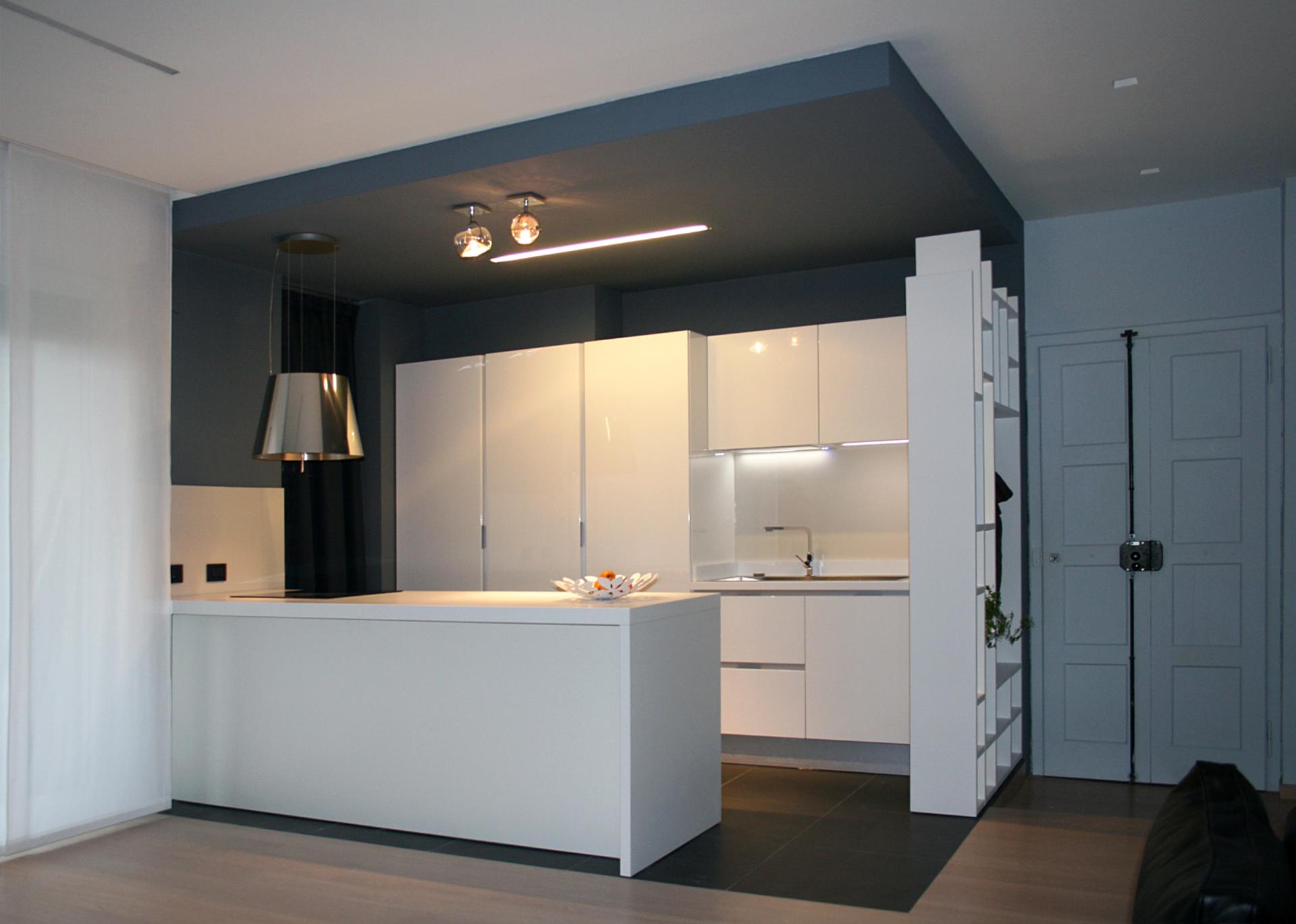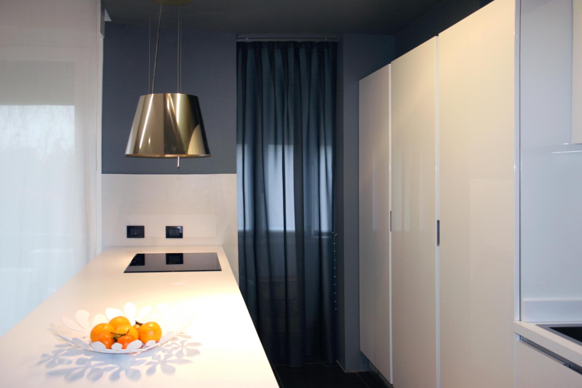La cucina laccata bianca affiora dal blu-grigio del pavimento e delle pareti, si dispone attorno alla penisola centrale con il piano ad induzione e si apre direttamente verso il pranzo. La libreria all’ingresso disegnata da StudioHOME separa la cucina dall’ingresso e dota quest’ultimo di comodi ripiani e di un appendiabiti. Nel soggiorno domina il nero del divano in pelle e della libreria (disegnata da StudioHOME) in netto e voluto contrasto con la zona cucina. Particolare attenzione è stata posta nello studio dell’illuminazione di questi ambienti, sono stati utilizzati faretti a scomparsa in gesso, tagli di luce e strisce led sapientemente nascoste dal cartongesso.