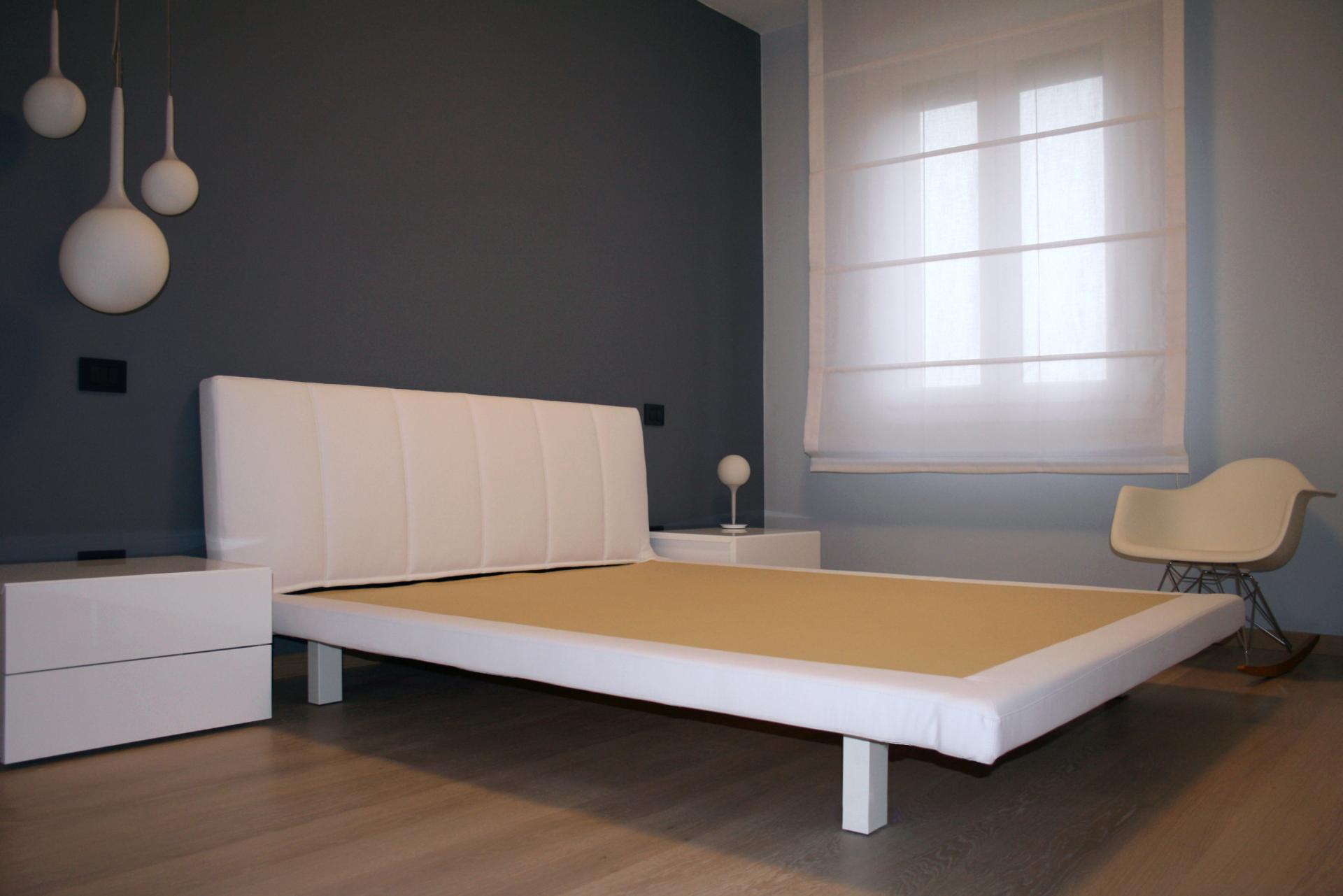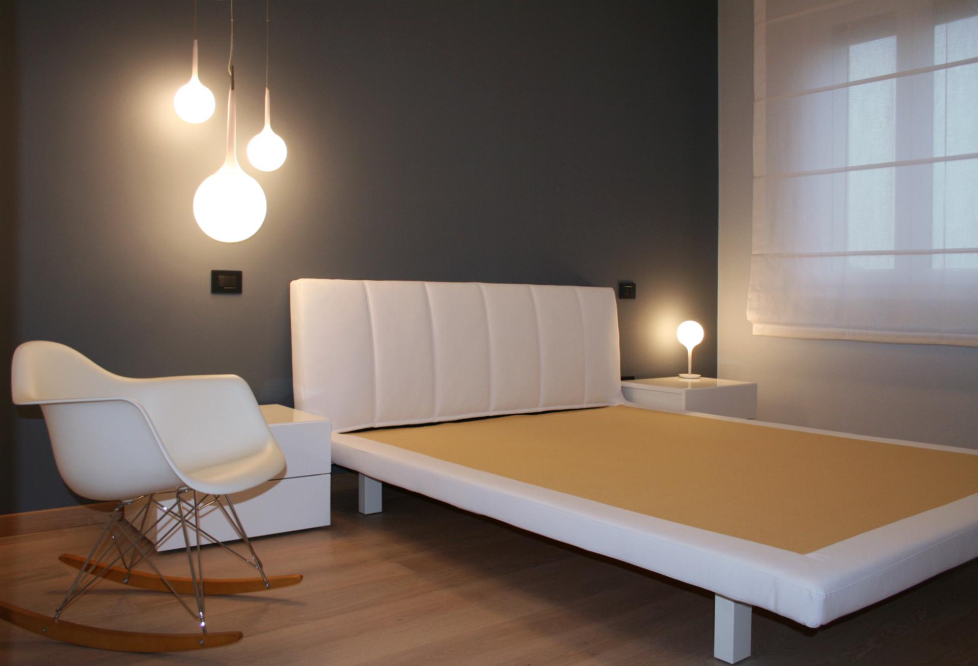 Nella camera matrimoniale ritroviamo il blu-grigio della cucina a fare da sfondo alla testata del letto, in primo piano le lampade bianche a sospensione che come un grappolo si calano dal soffitto sul comodino e disegnano un motivo sulla parete scura.
