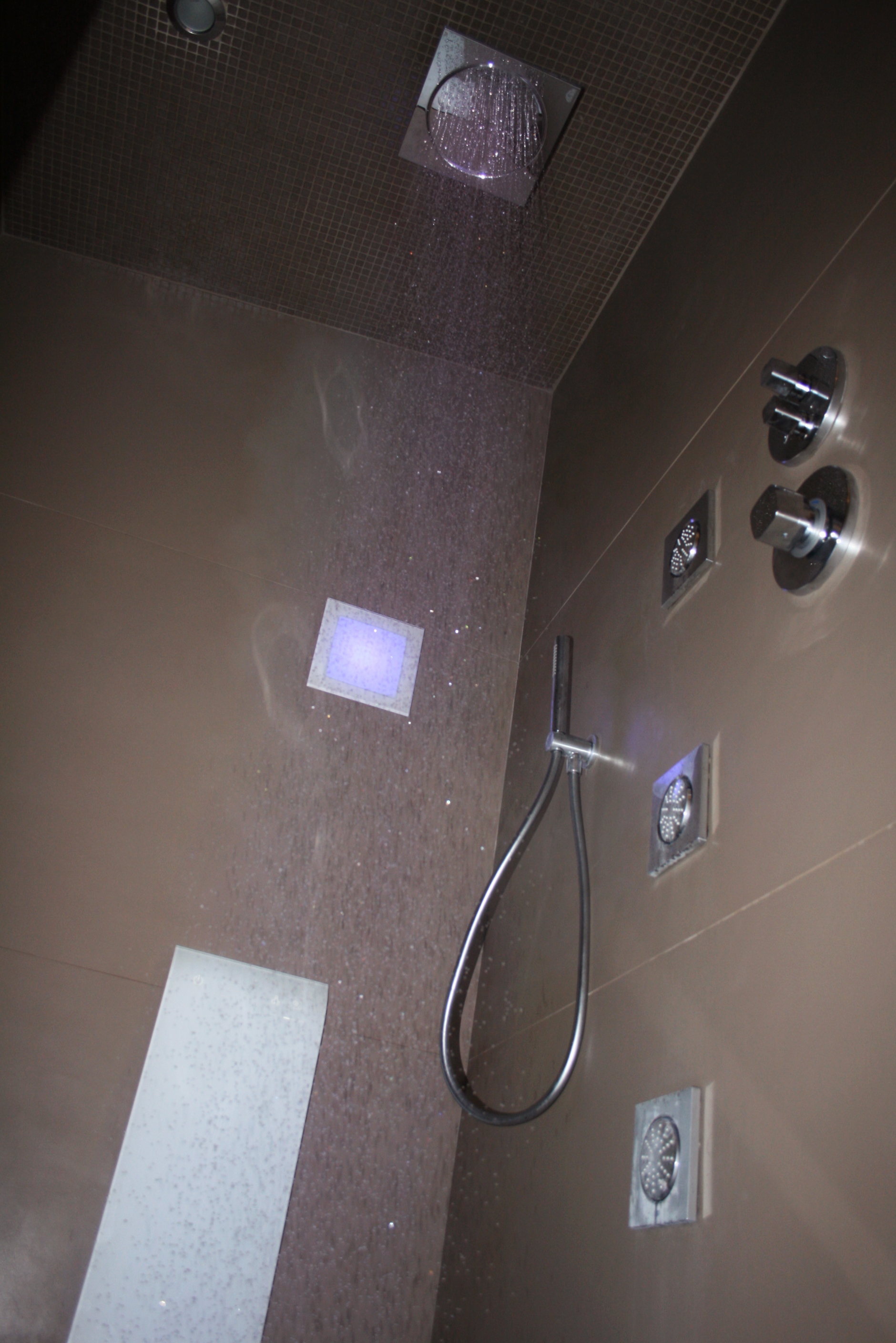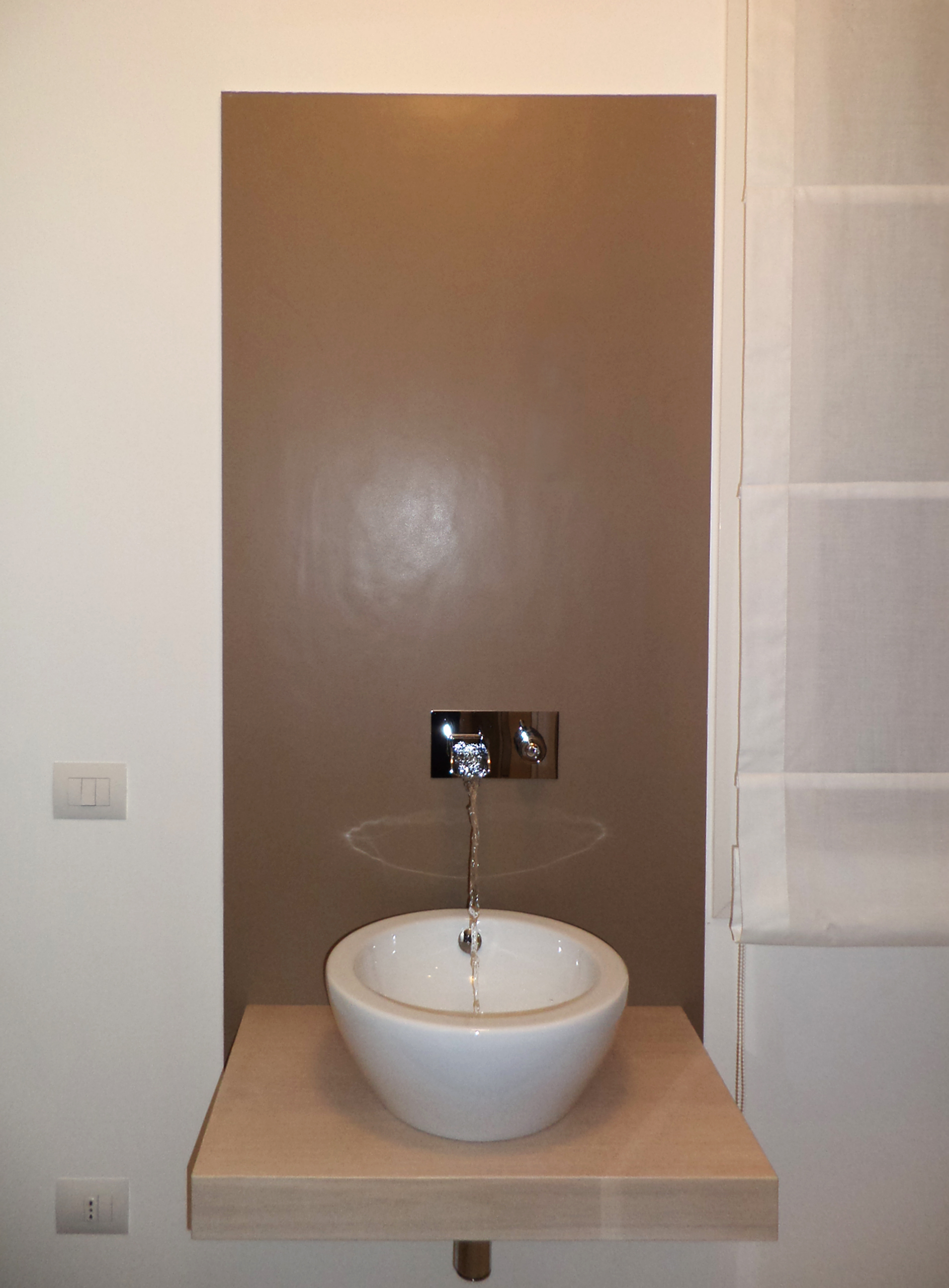 Altra punta d’eccellenza dell’appartamento è il bagno con zona relax dotato di bagno turco e vasca idromassaggio, qui dominano il color tortora ed il bianco.