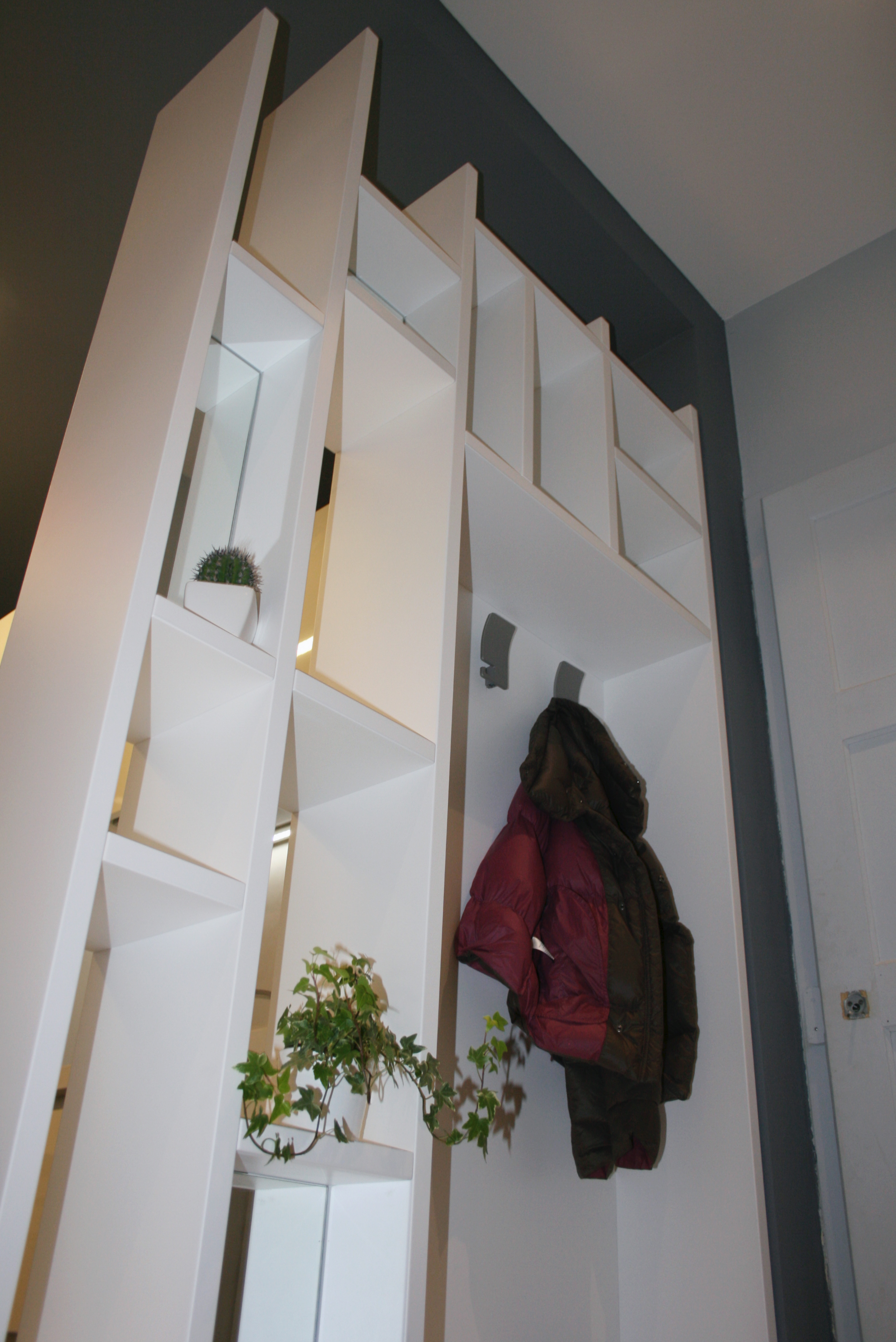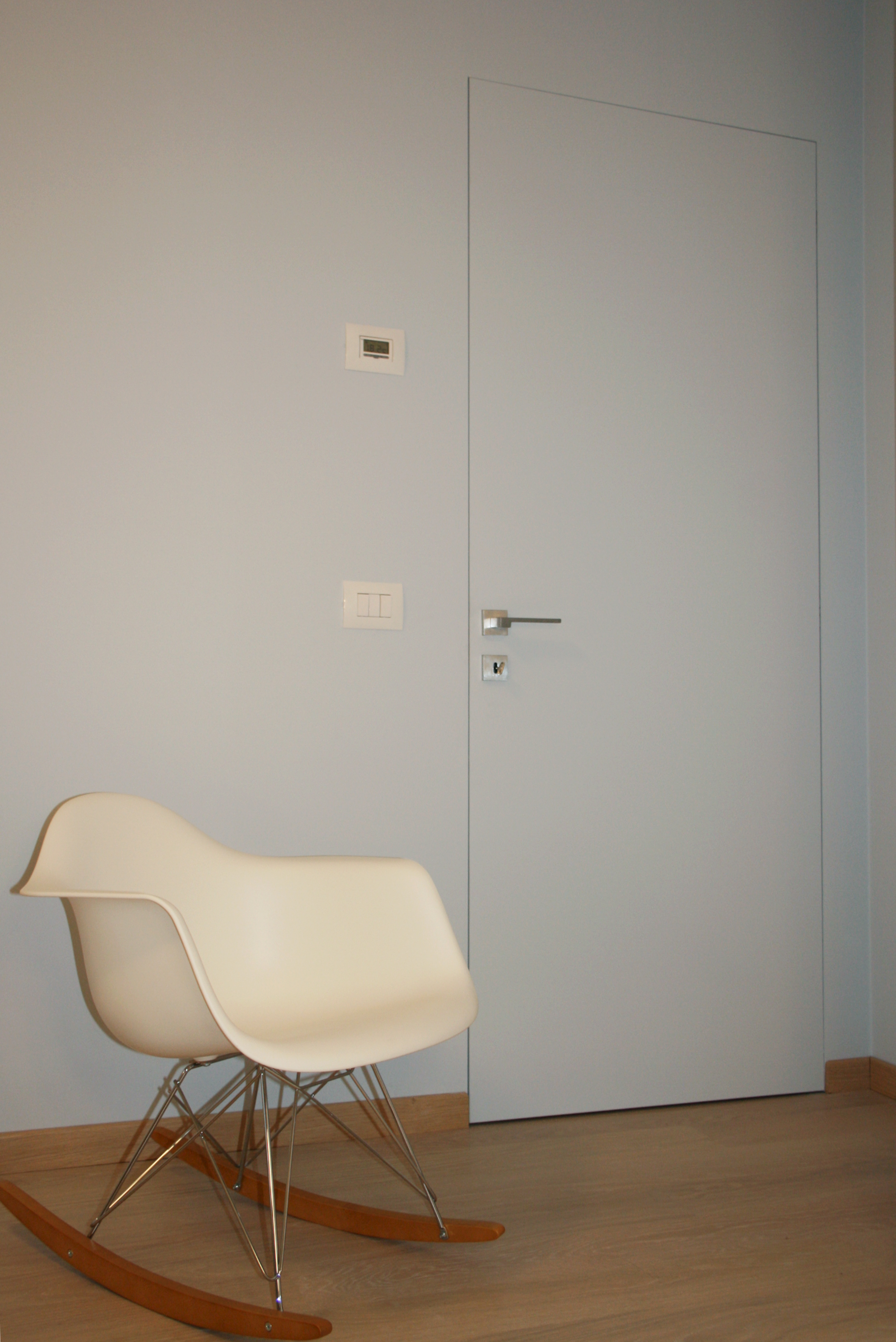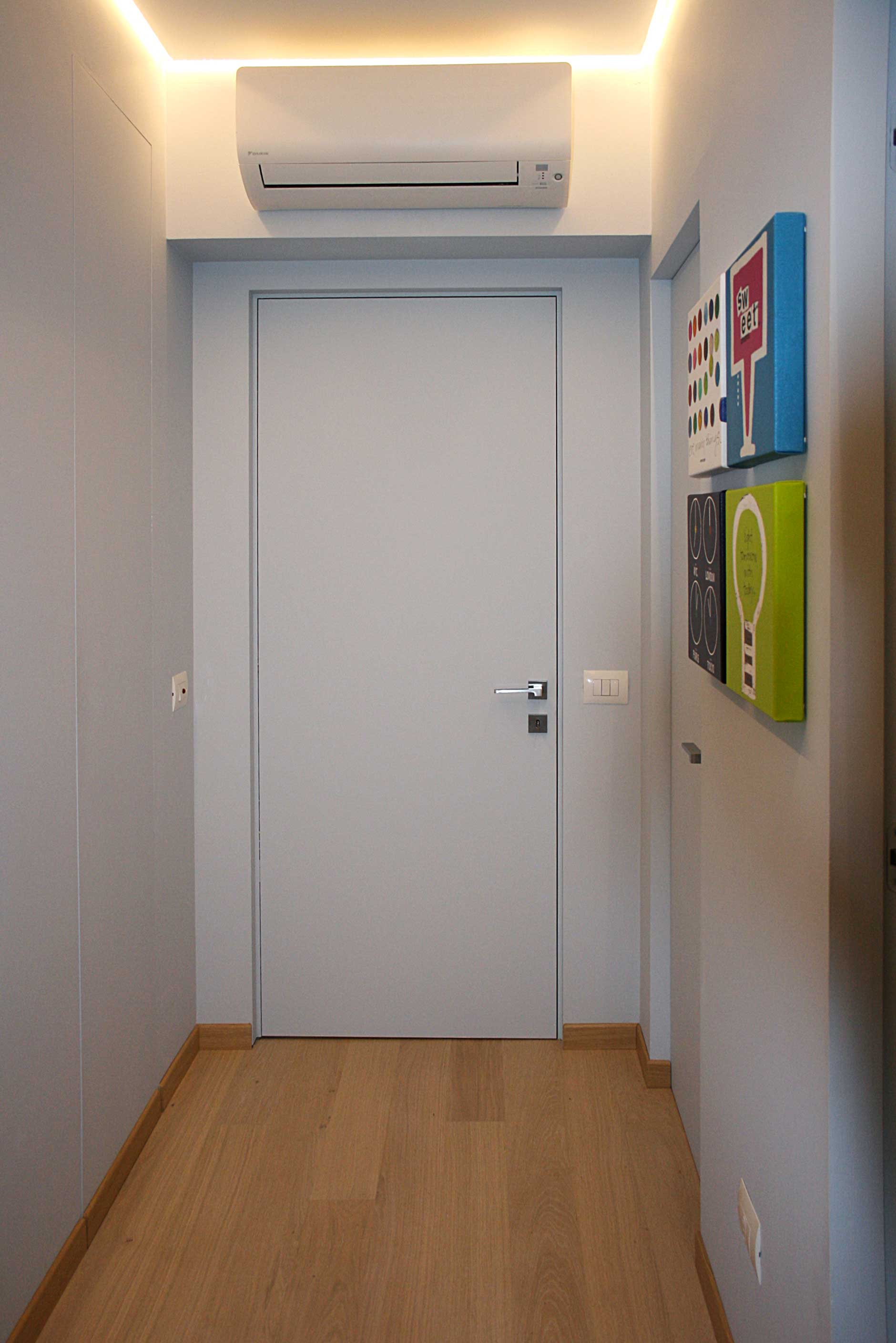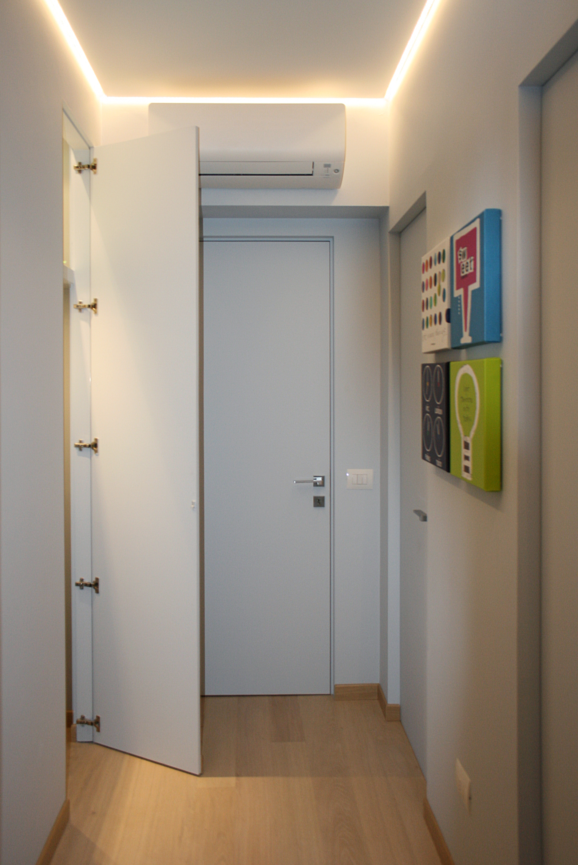 Nel disimpegno che separa la zona giorno dalla zona notte è stato ricavato un comodo ripostiglio a scomparsa grazie all’utilizzo del pannello a filo muro “nicchio” de “L’Invisibile”.
